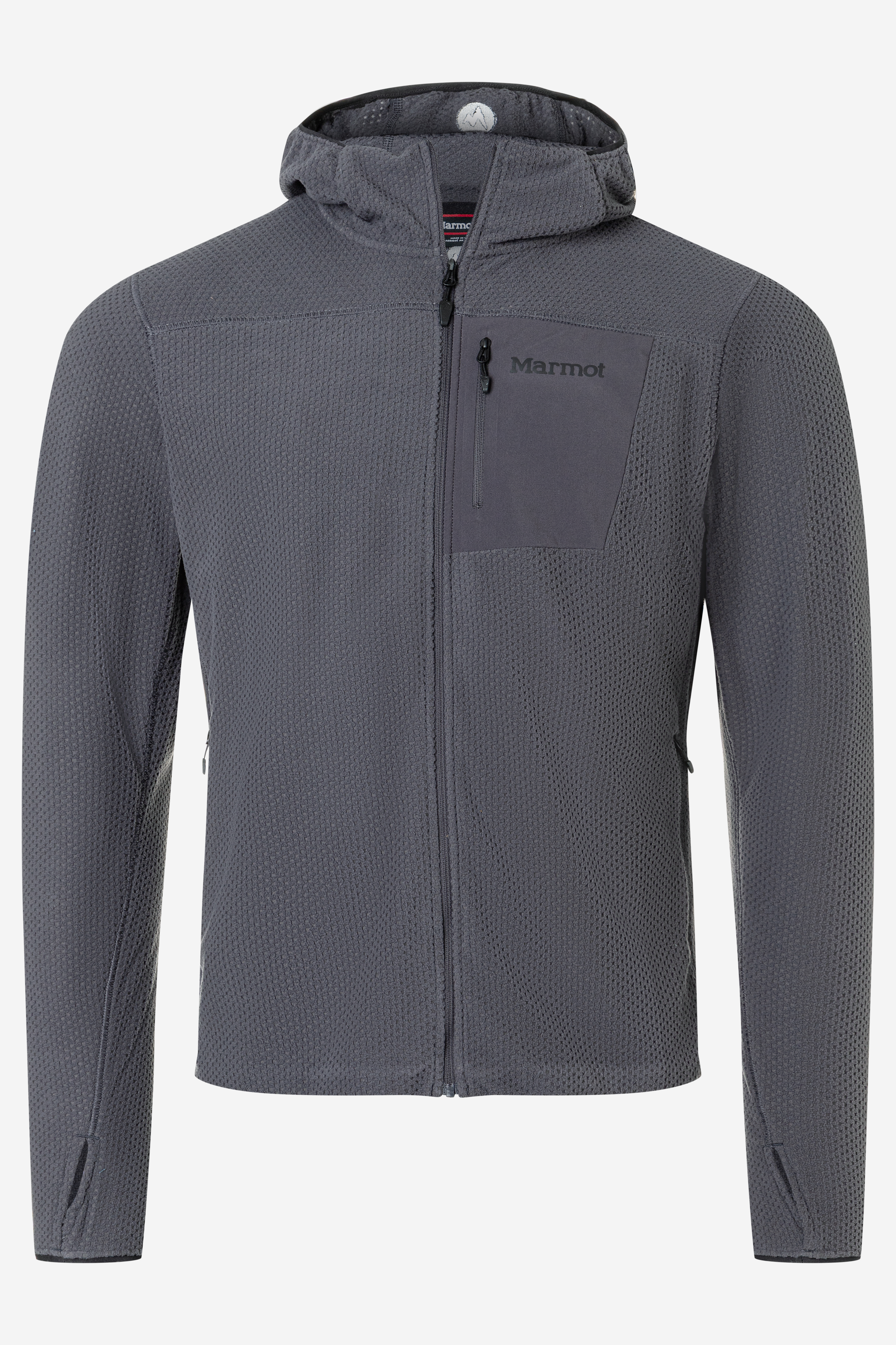 The Marmot AirFleece Hoody is a men’s lightweight fleece hoodie designed for hiking, layering, and active outdoor use. It is made from 100% recycled polyester jacquard fleece with a distinctive grid structure that improves breathability, traps warmth, and reduces bulk, while the slim fit makes it an excellent midlayer under a shell or jacket.