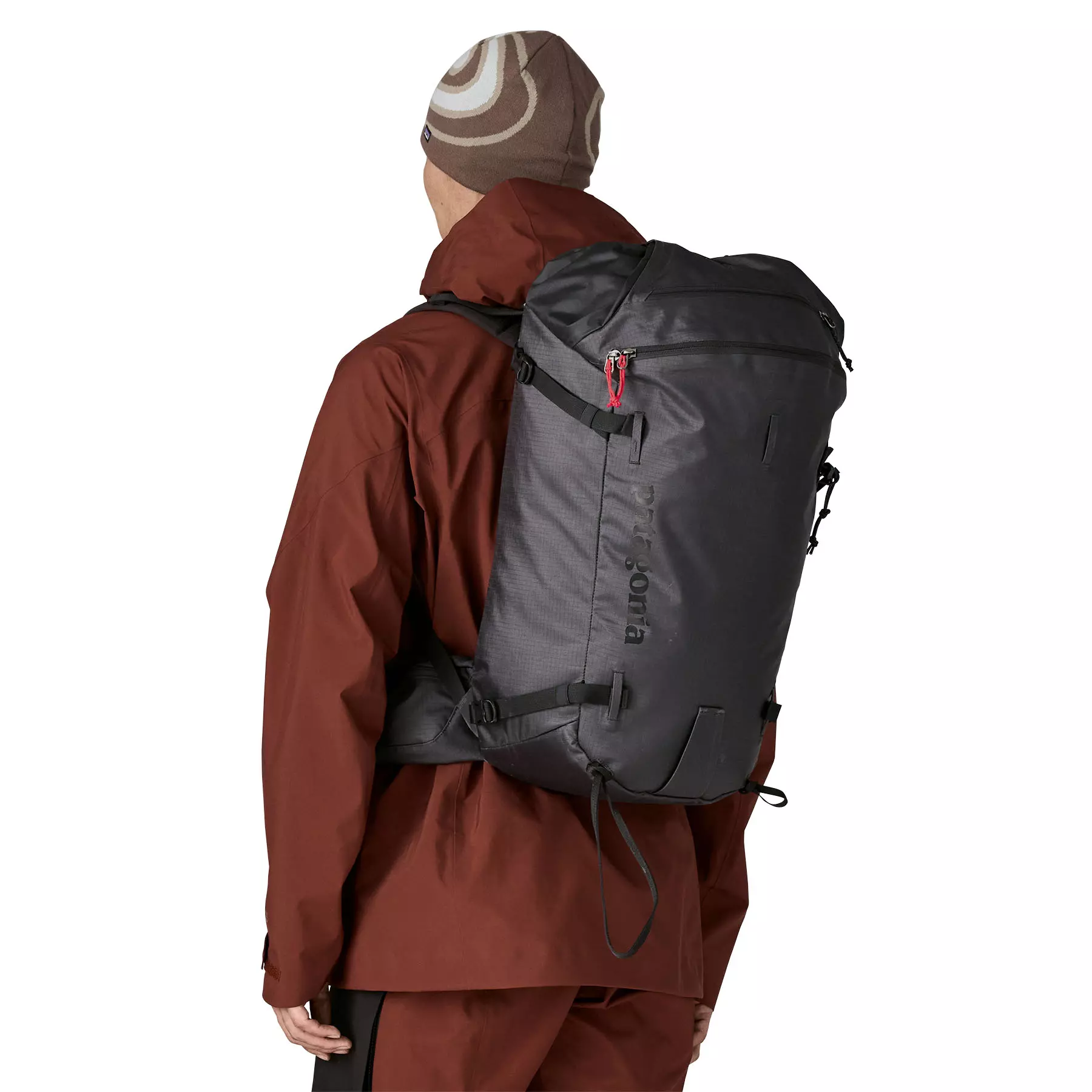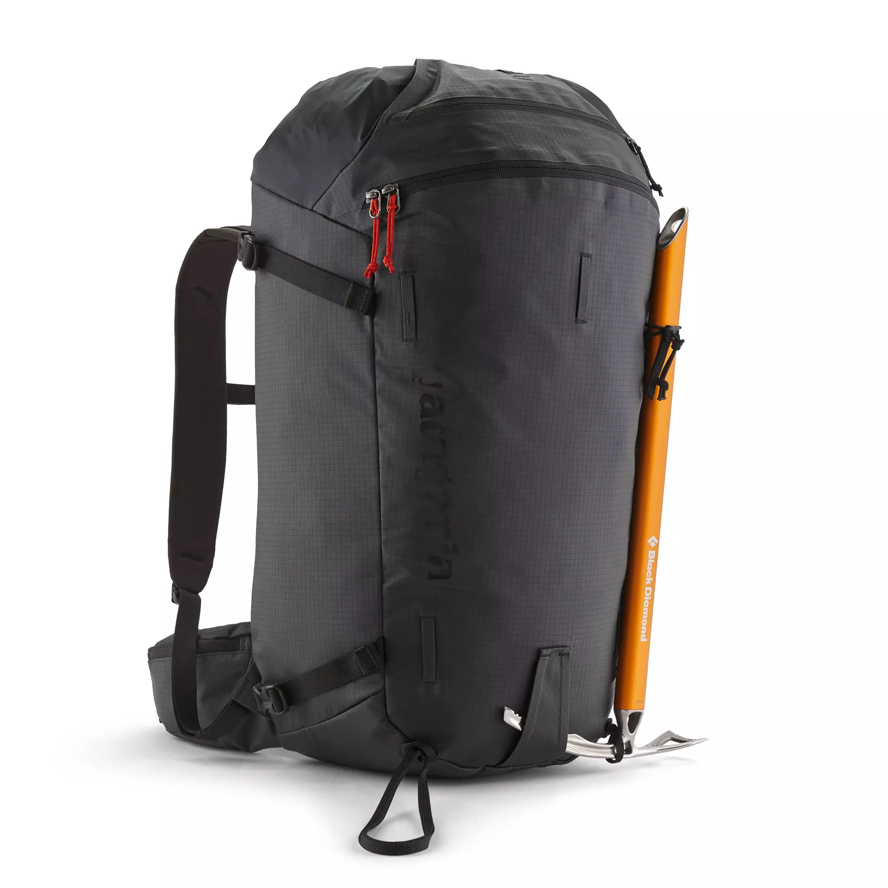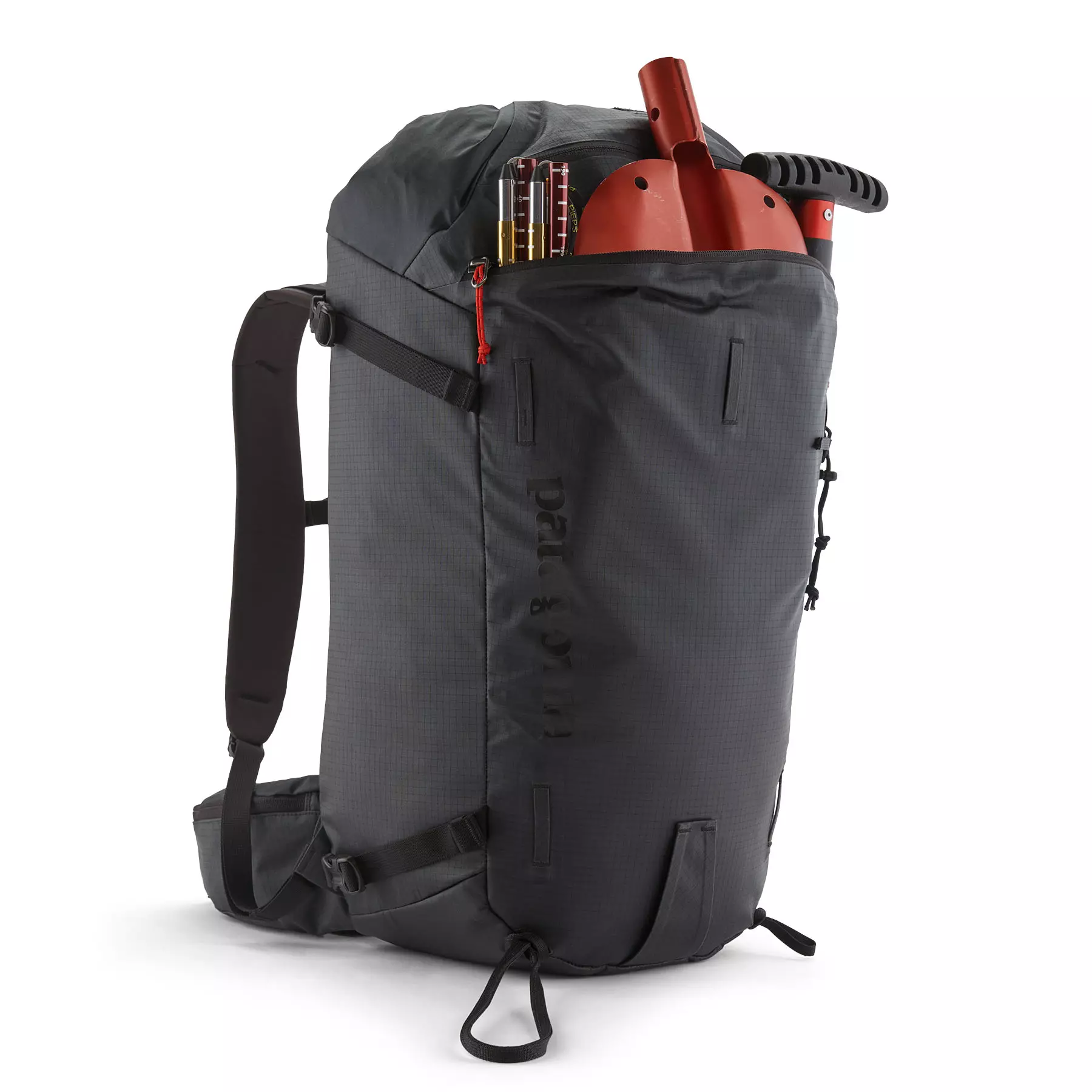 Snow-safety pocket with organization sleeves keeps tools at the ready; an ice axe can be carried on the outside or fits inside the pack.