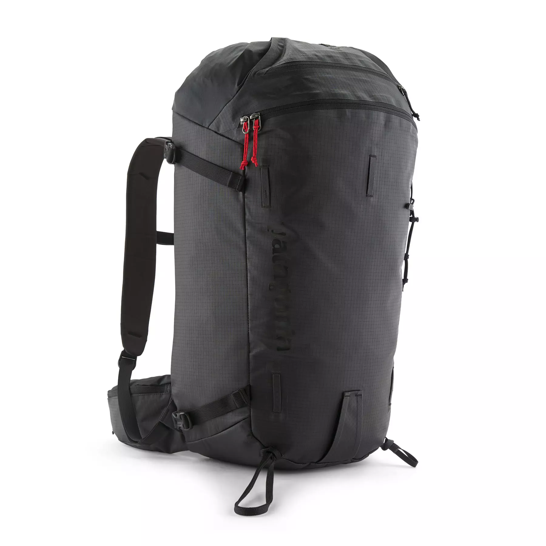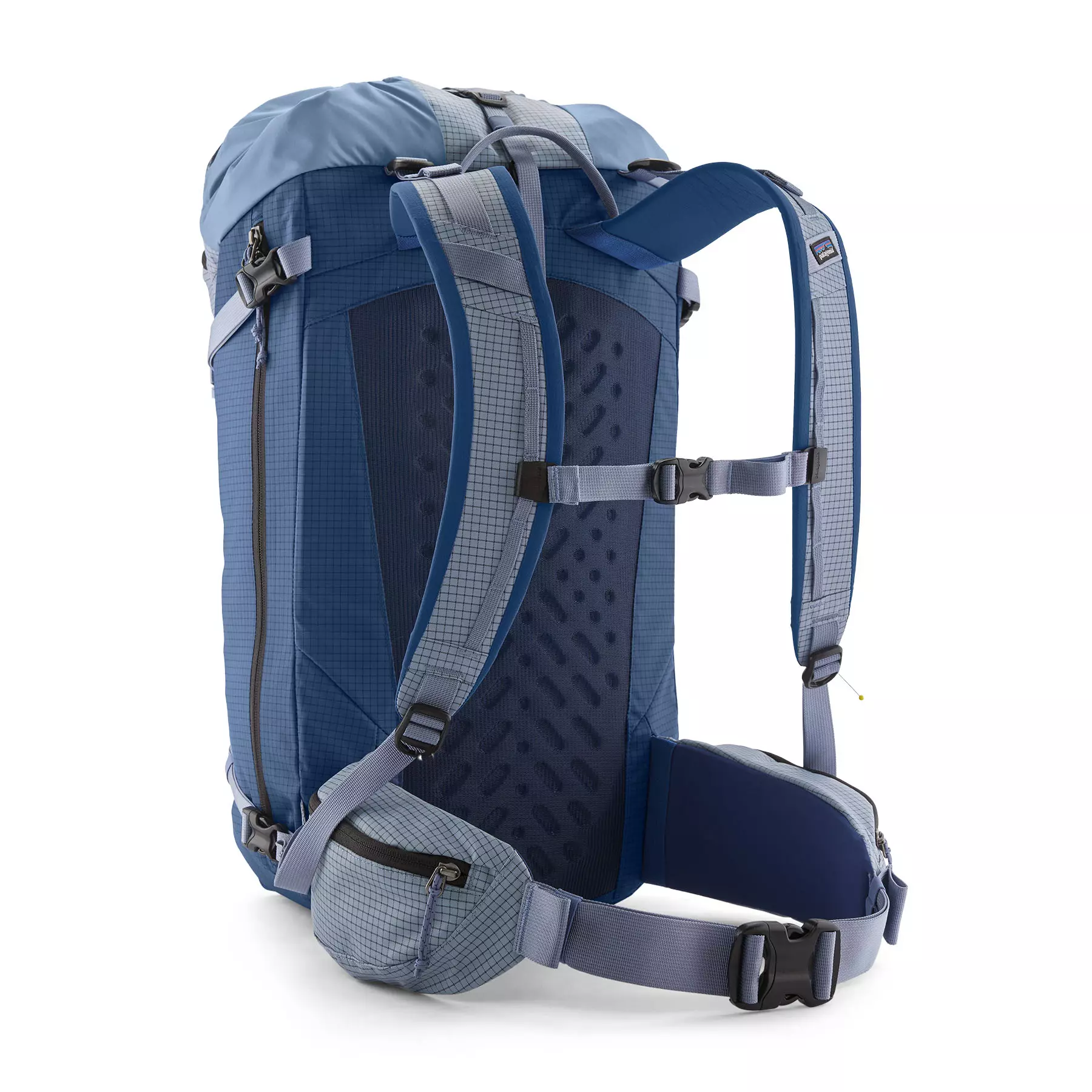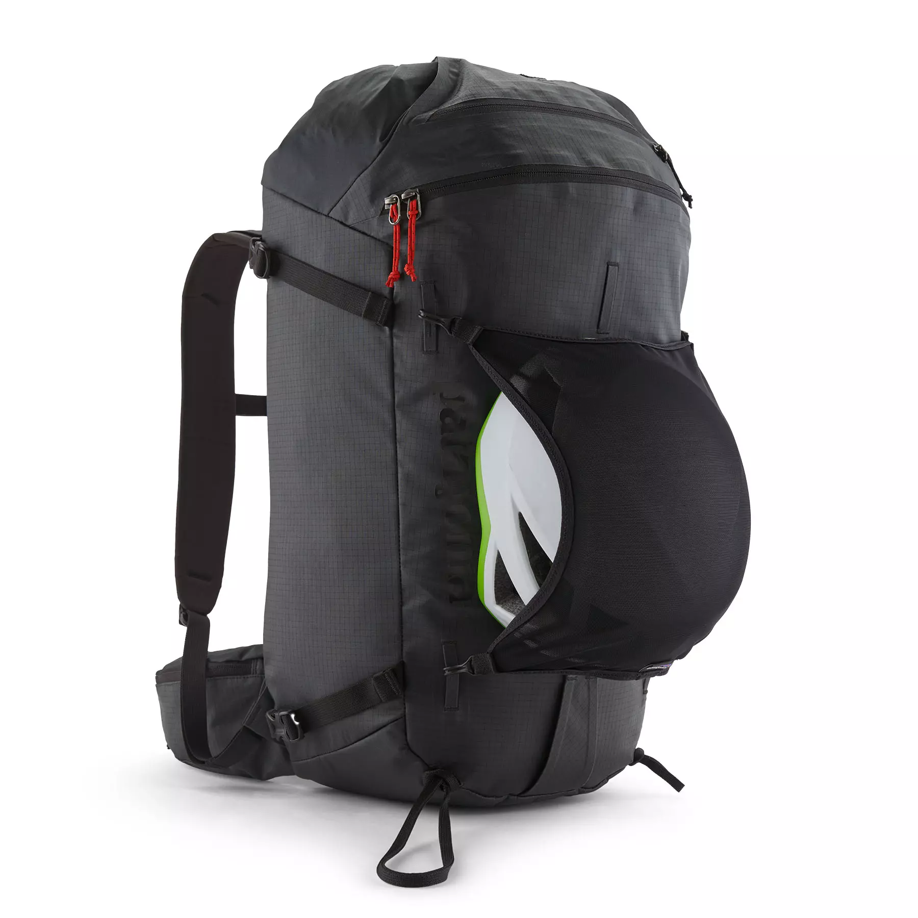 Snow-safety pocket with organization sleeves keeps tools at the ready; an ice axe can be carried on the outside or fits inside the pack.