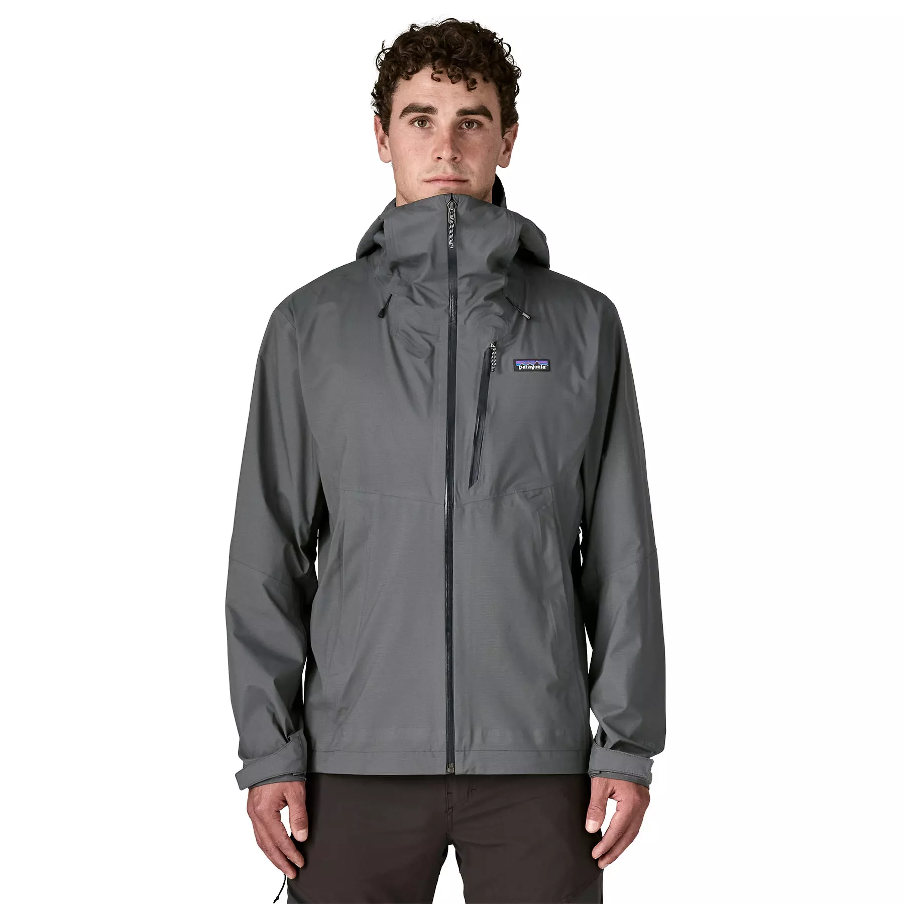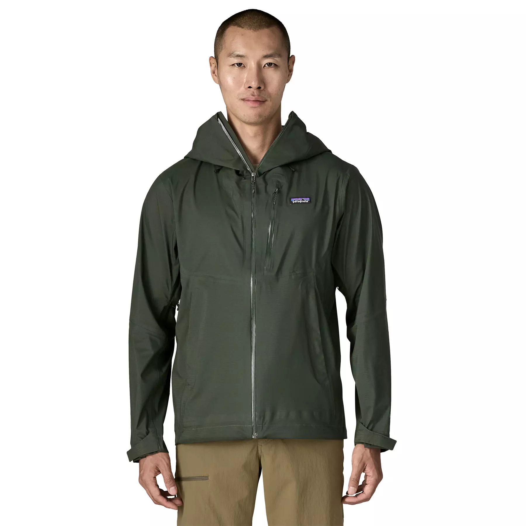 Center-front zipper and a chest pocket have watertight zips and zipper garages; two welted handwarmer pockets stay clear of a pack waistbelt or a harness