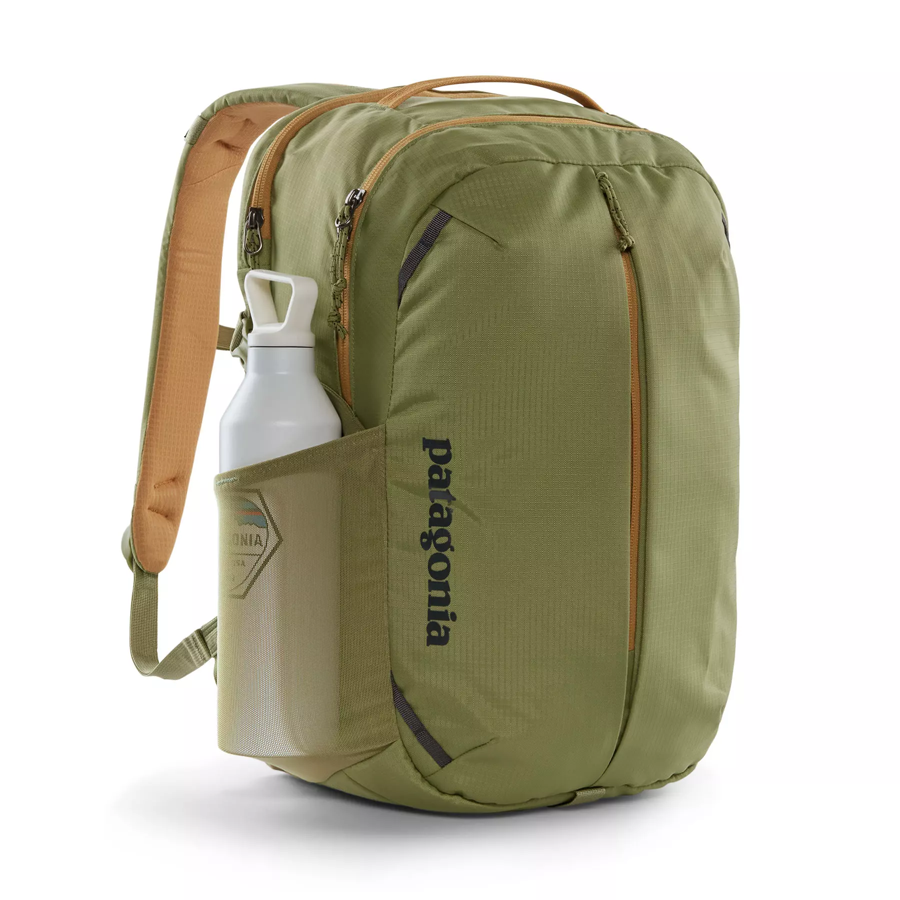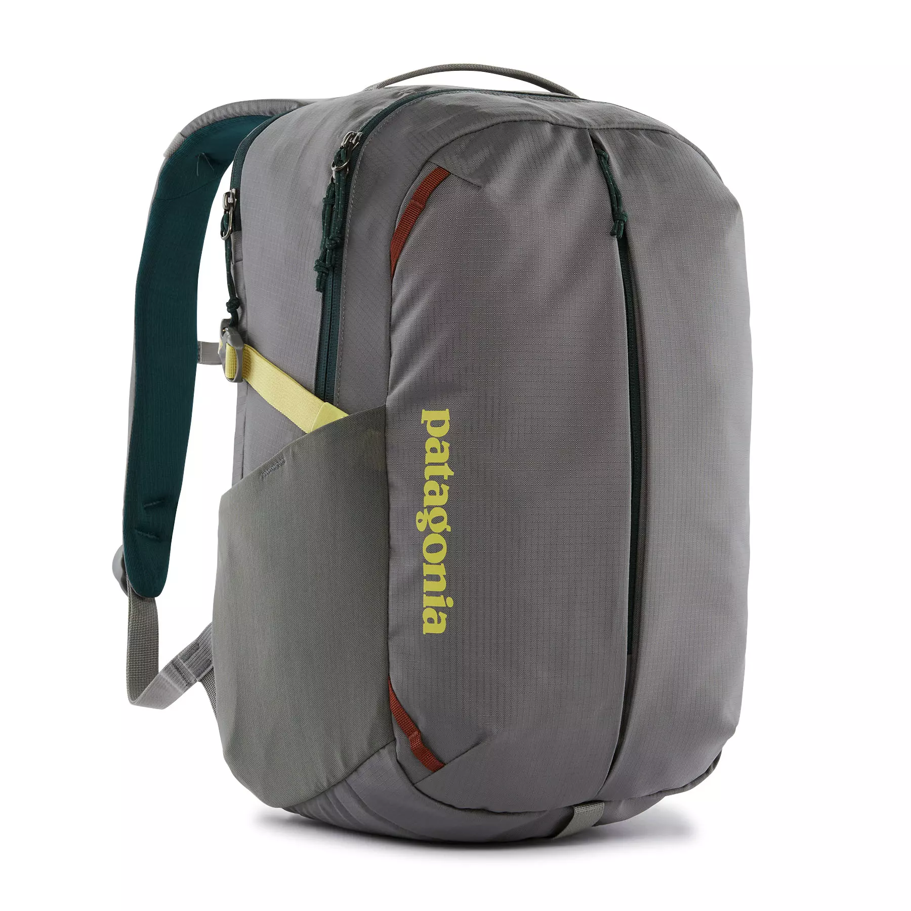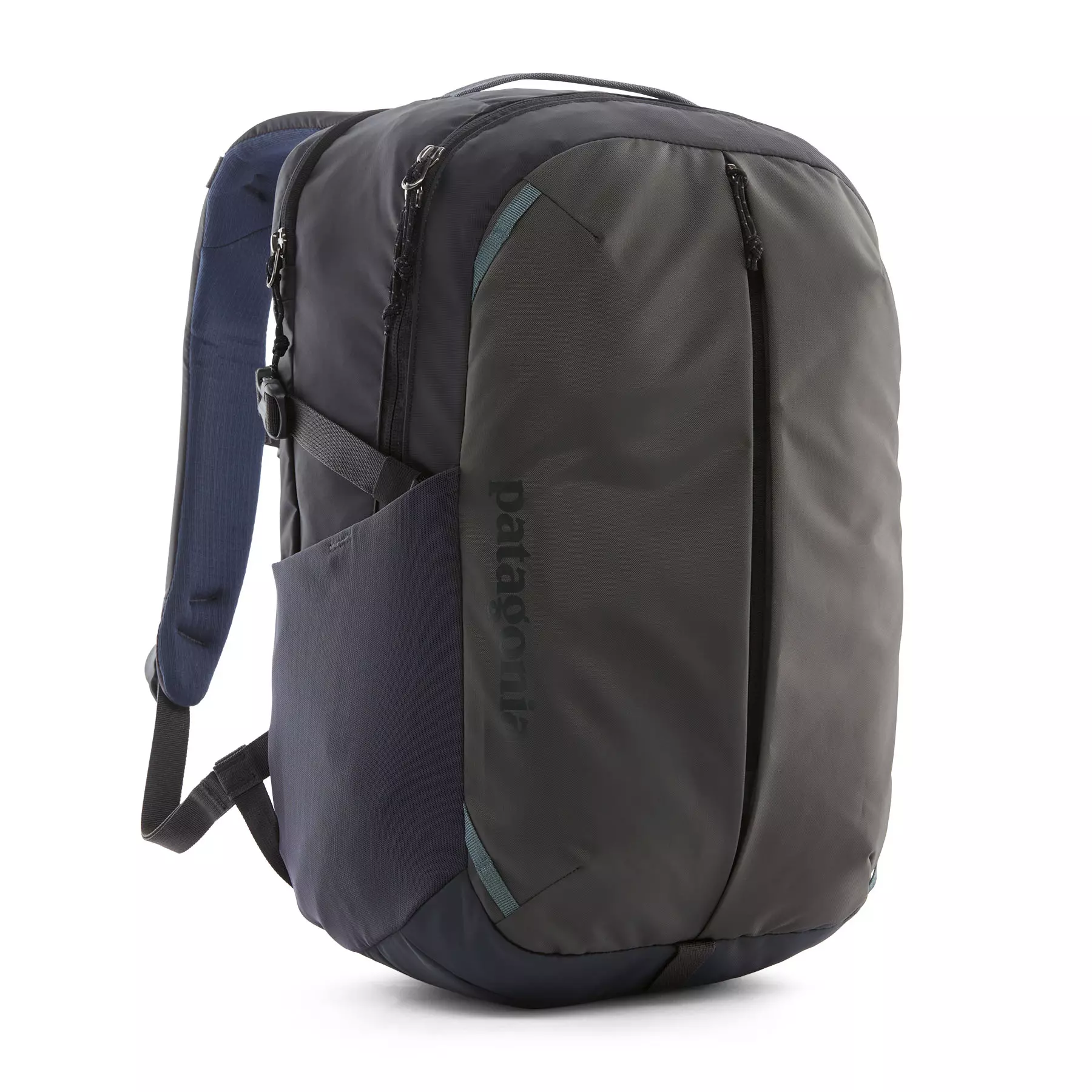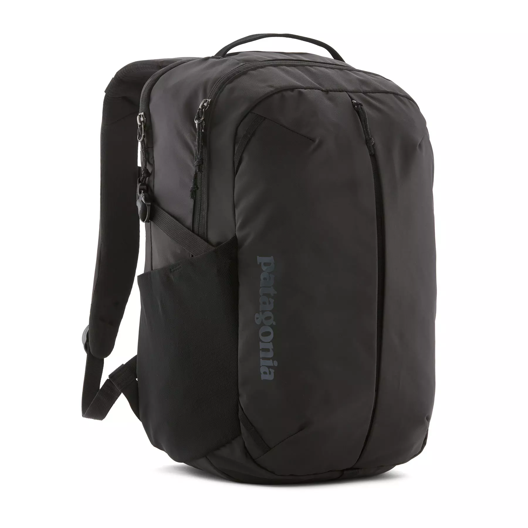 To resist light moisture, this 26-liter pack is treated with a durable water repellent (DWR) finish made without perfluorinated chemicals (PFCs/PFAS); all fabrics are 100% recycled except the stretchy mesh for the side pockets, which is a 72% recycled nylon/28% elastane blend