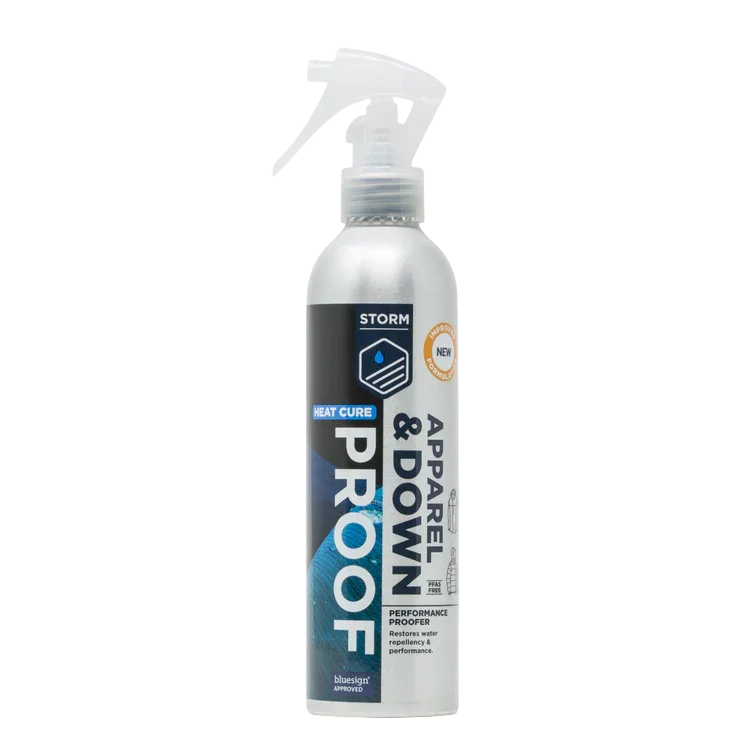 Storm Apparel Proofer Spray (Heat Cure) is a high-performance waterproofing treatment designed to restore the durable water-repellent (DWR) finish of technical clothing and outdoor gear. The spray format allows precise application to high-wear areas, while the heat-activated formula bonds to the fabric during drying to create a durable, abrasion-resistant finish. It enhances water repellency without compromising breathability, making it ideal for maintaining waterproof jackets and performance apparel.
