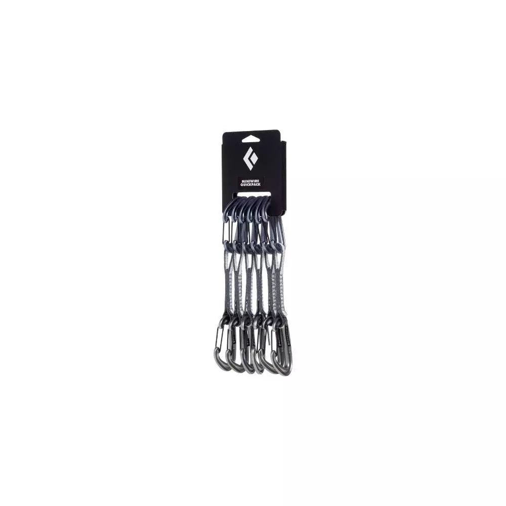 A six pack of our Black Diamond MiniWire Quickdraw, our lightest in the line. Ideal for trimming ounces on all-day gear routes and marathon sport pitches, the MiniWire draw features our hot-forged MiniWire carabiners on the top and bottom as well as a lightweight 10 mm Dynex dogbone with an integrated Straitjacket insert, which keeps the bottom biner in the optimal clipping position. The MiniWire Quickdraw shines on alpine missions and any climb where a light rack can make or break the crux.
