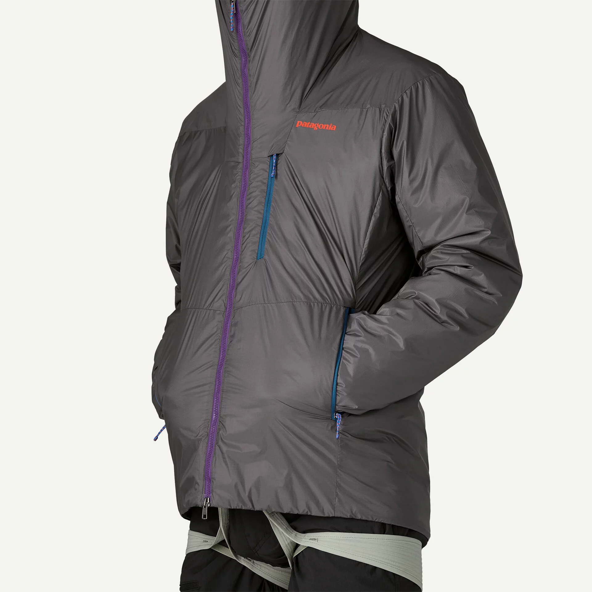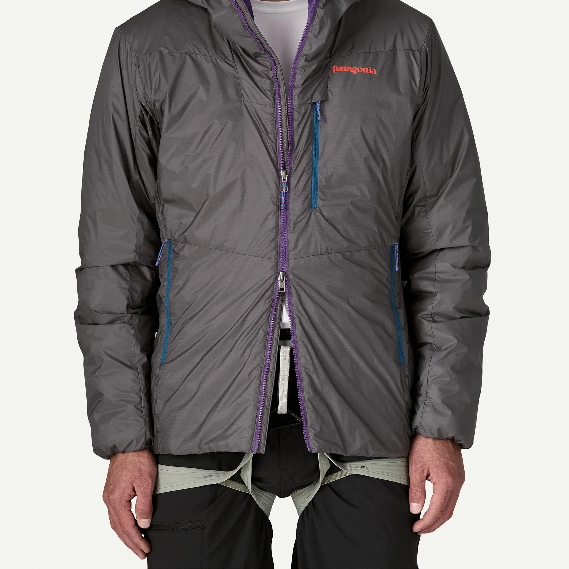 Two-way, center-front Vislon® zipper backed with an internal wind flap allows for belay loop access