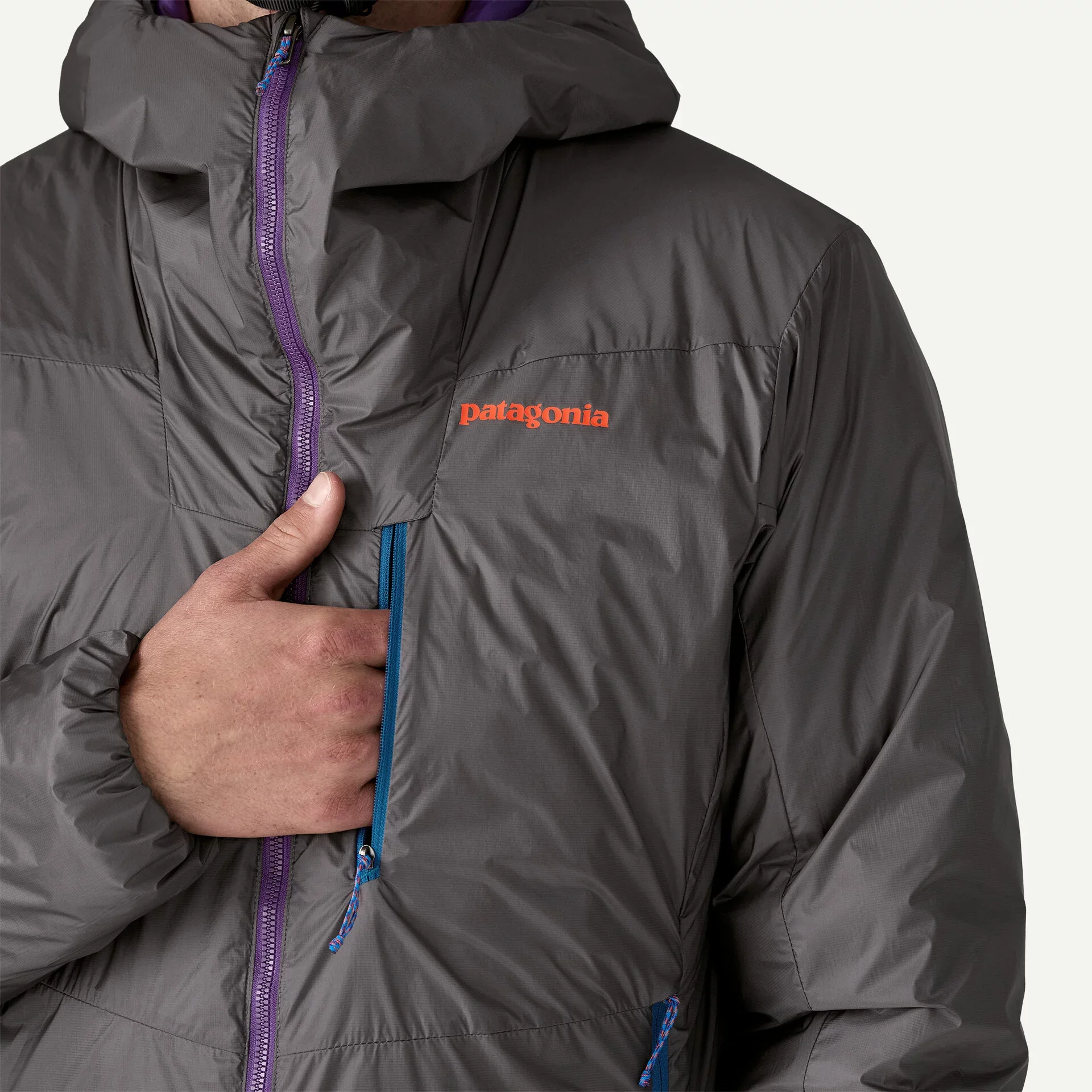 External left-chest pocket and two handwarmer pockets, all outfitted with zipper garages; self-stuffs into left-front pocket