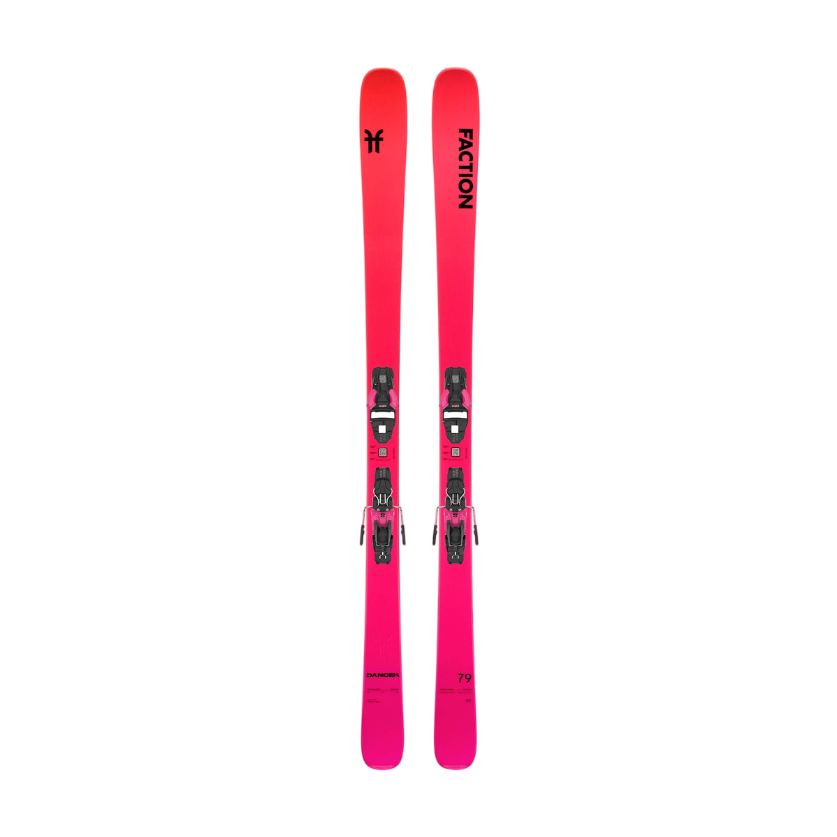 The Faction Dancer 79 Ti SYS Pink skis are powerful and precise piste skis with Titanal reinforcement and pre-mounted bindings, perfect for advanced skiers.