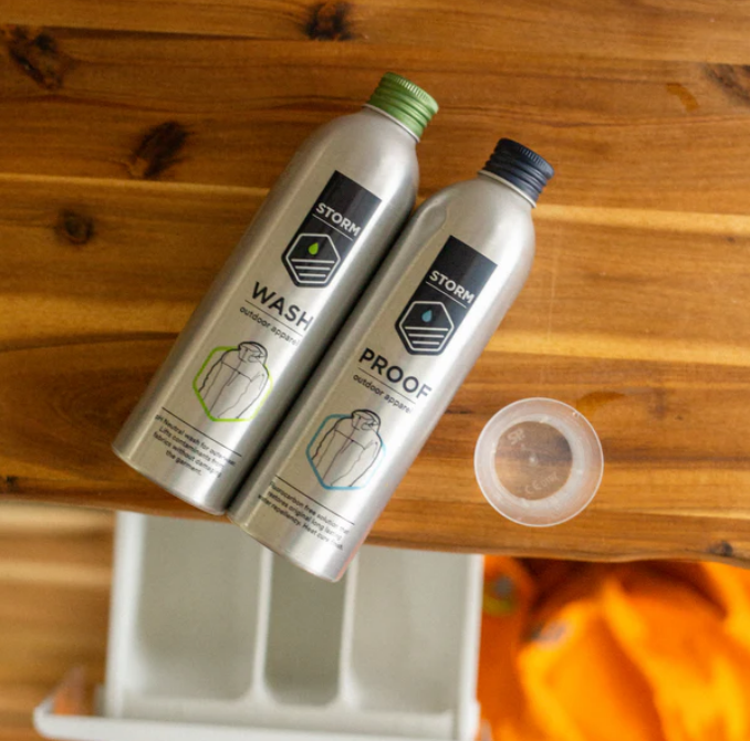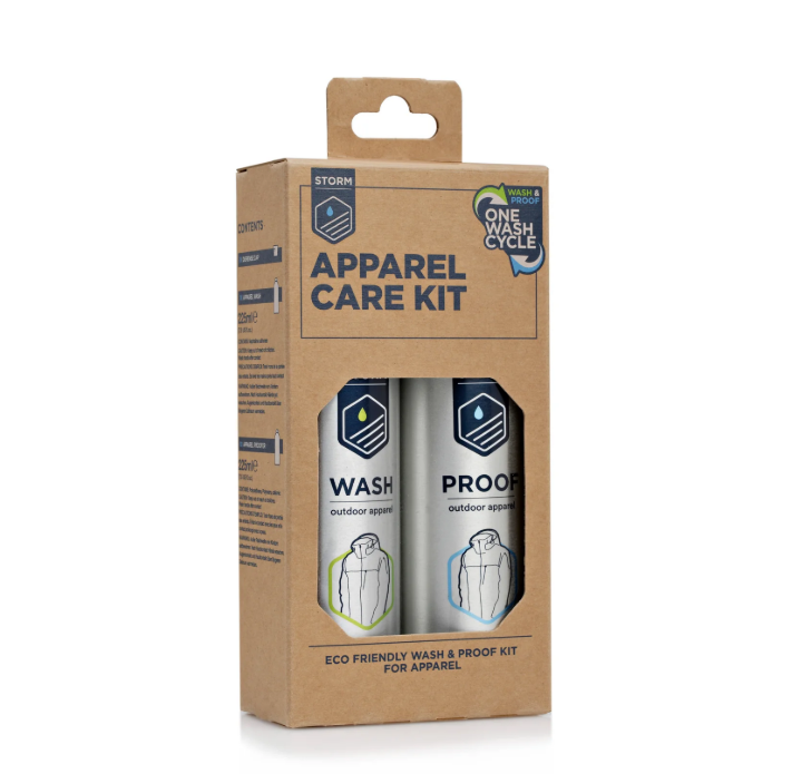 The Storm Apparel Wash & Proof Twin Pack is a premium care solution for technical clothing, combining a specialised wash detergent and a waterproofing agent. It effectively cleans fabrics while restoring durable water repellency (DWR).
