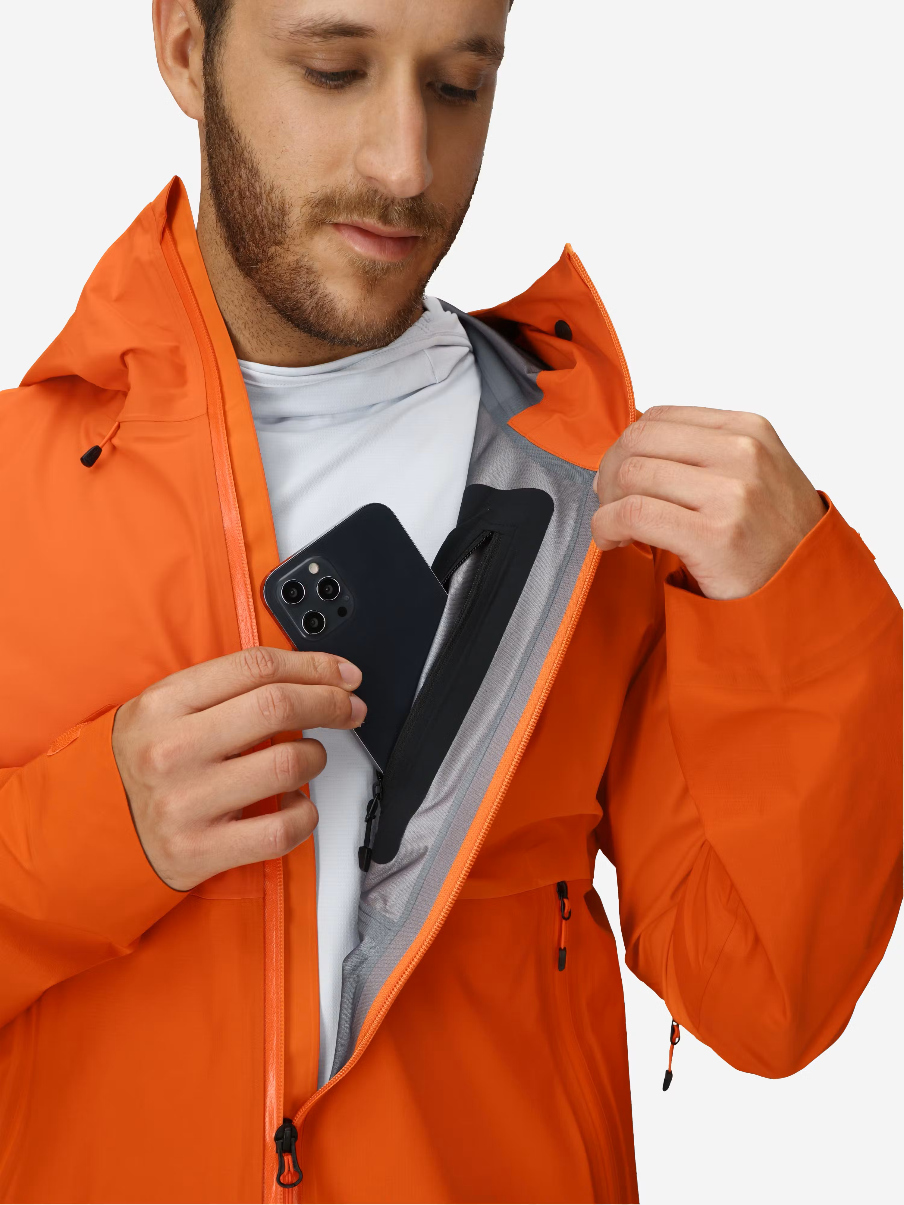 Features include an adjustable helmet-compatible hood, waterproof zippers, pit zips for ventilation, and zippered pockets accessible while wearing a backpack or harness. Its lightweight construction makes it easy to pack and carry.