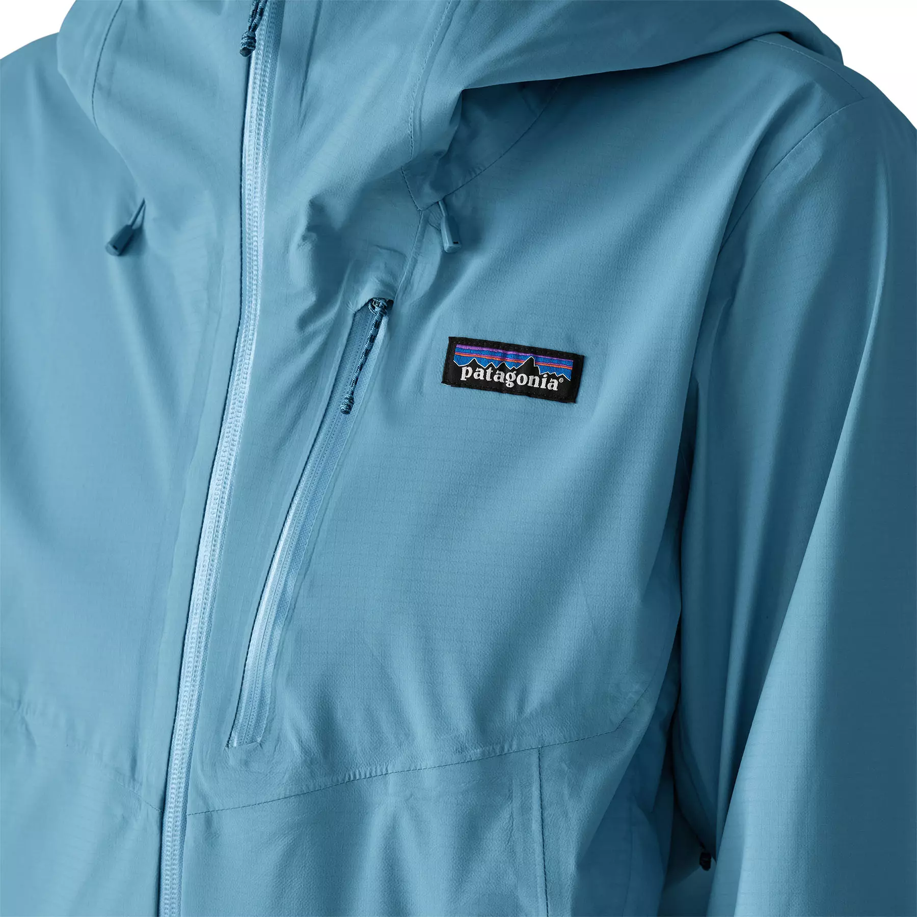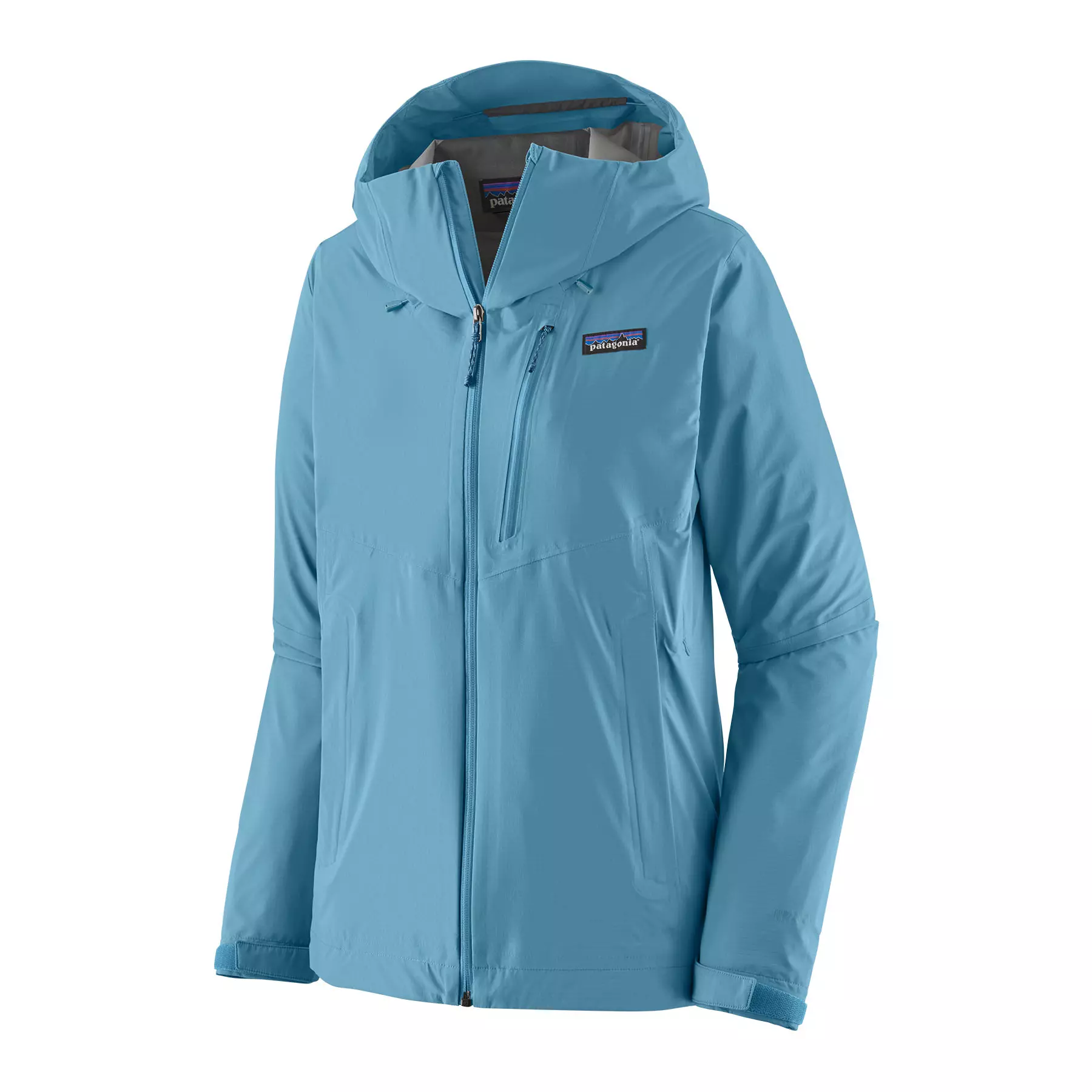 Center-front zipper and a chest pocket have watertight zips and zipper garages; two welted handwarmer pockets stay clear of a pack waistbelt or a harness